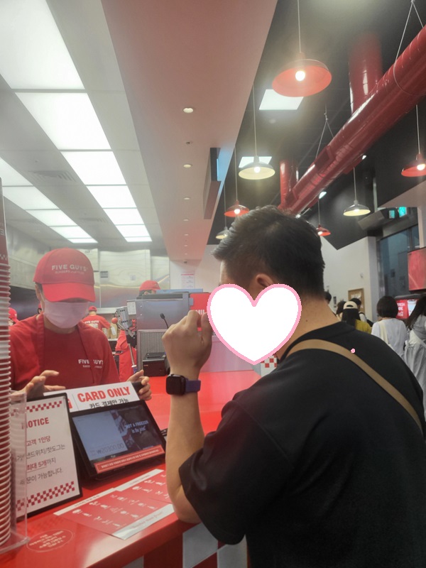 매장에 들어서면 첫 느낌은 '깔끔하다'는 것이었어요. 넓고 쾌적한 공간에 흰색과 빨간색을 조화롭게 사용한 인테리어가 눈에 띕니다. 벽에는 파이브가이즈의 역사와 철학을 담은 글귀들이 적혀 있어서 흥미롭기도 했어요. 오픈 주방이라 조리 과정을 볼 수 있다는 점도 신뢰감을 주는 요소 중 하나였습니다.