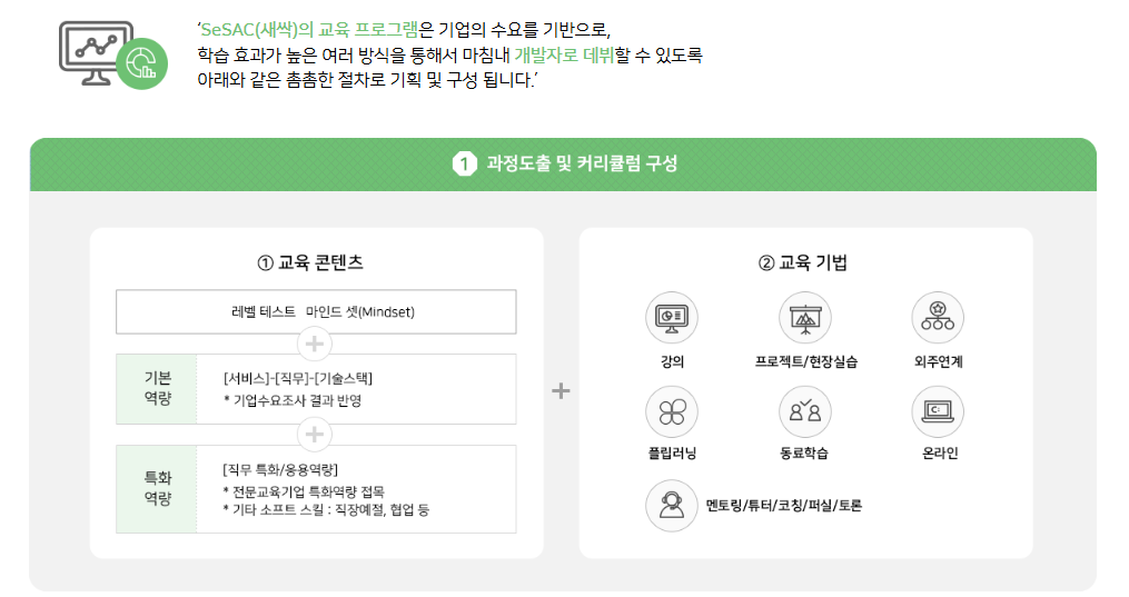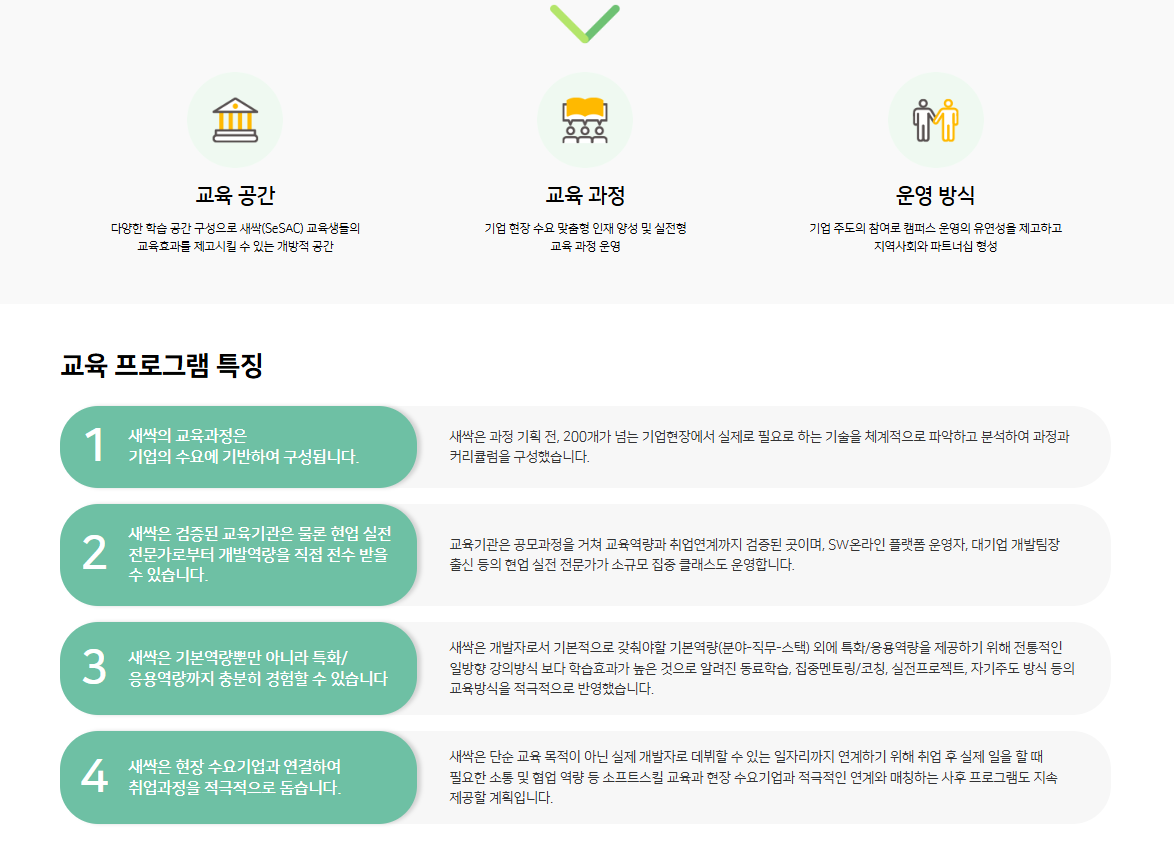 새싹(Seoul Software Academy, SeSAC)은 캠퍼스의 교육브랜드로 서울시에서 SW인재 양성을 위해 ‘싹’을 틔우고 성장시켜, 개발자를 꿈꾸는 청년들이 ‘SW개발자로 데뷔’ 할 수 있도록 돕는 교육 프로그램을 의미합니다.