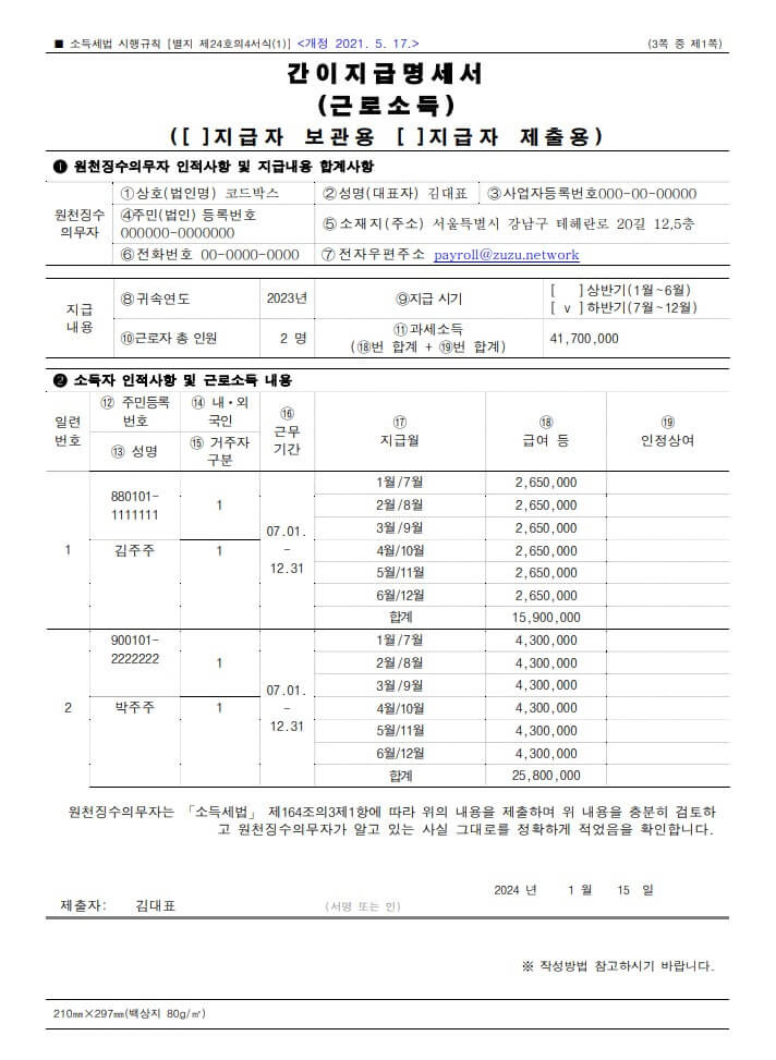 | 서류·데이터 준비 | 지급명세서 양식, 지급일·금액·원천징수액 등이 매월 준비 가능하도록 |