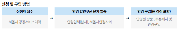 신청 시 희망하는 안경업체를 선택해 신청할 수 있으며, 대상자에게는 신청한 안경업체에서 사용할 수 있는 안경 할인쿠폰이 휴대전화 문자를 통해 발급된다. 쿠폰 사용기한은 6개월이다.